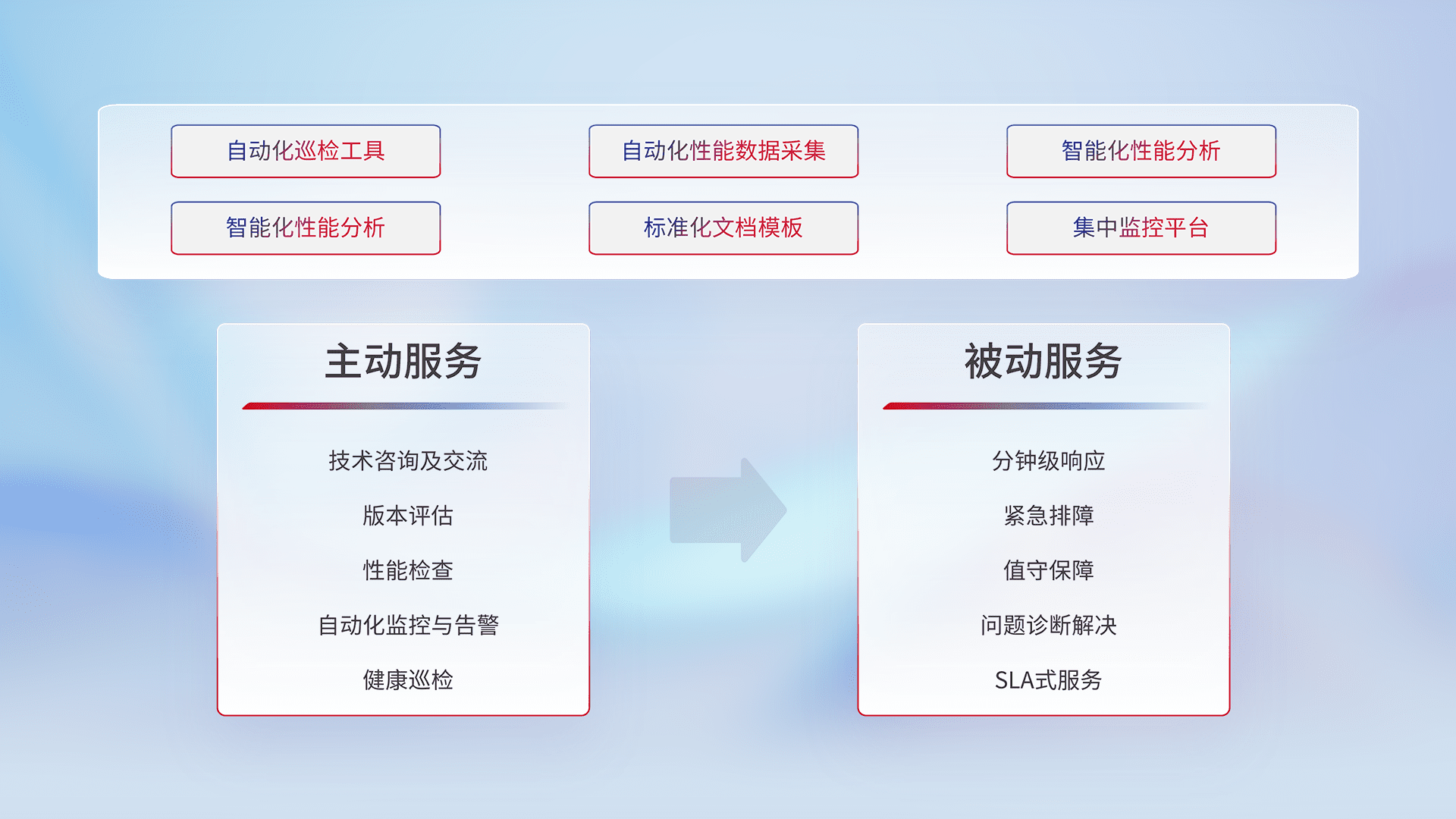 智能化工具和标准化文档,,,,保障服务质量,,提供主动服务(包含技术咨询、、、版本评估、、、性能检查、、自动化监控与告警、、健康巡检)和被动服务包含(分钟级响应、、紧急排障、、、、值守保障、、问题诊断解决、、SLA服务)。。。